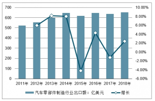 2011-2018年中國汽車零部件制造行業(yè)出口額及同比增長走勢