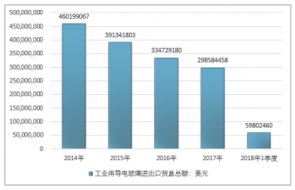 2016年我國工業用導電玻璃進出口貿易總額334729180美元,2017年進出口貿易總額298584458美元;2019年1季度進出口貿易總額59802460美元。