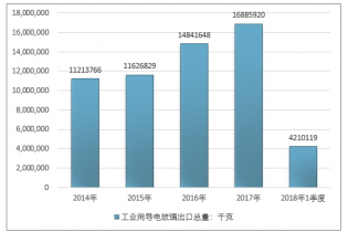 2016年我國工業用導電玻璃出口總量14841648千克 ,2017年出口總量16885920千克 ;2019年1季度出口總量4210119千克 。