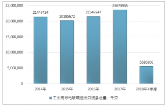 2016年我國工業用導電玻璃進出口貿易總量21549247千克 ,2017年進出口貿易總量23673935千克 ;2019年1季度進出口貿易總量5583806千克 。