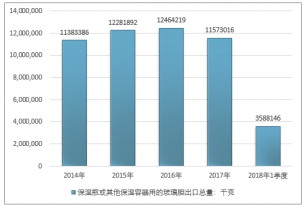 2016年我國保溫瓶或其他保溫容器用的玻璃膽進出口貿易總量14085089千克 ,2017年進出口貿易總量13201715千克 ;2019年1季度進出口貿易總量3828397千克 。