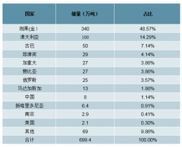 全球鈷礦資源分布集中度較高,全球鈷資源儲量約 700 萬噸,儲產比 57 年。鈷資源地理分布不平衡,主要集中在剛果(金)、澳大利亞、古巴、菲律賓、加拿大、俄羅斯、贊比亞、新喀里多尼亞等地,約占世界鈷總儲量 78%。剛果(金)的鈷儲量為 340 萬噸,占全球鈷儲量的 48%,居世界第.一位。相較而言,我國鈷資源十分稀缺。