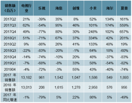 在地產(chǎn)行業(yè)回暖拉動作用下,2019年 4 月份電視機(jī)行業(yè)負(fù)增長幅度持續(xù)收窄,同比下滑 4%。 18 年以來電視機(jī)行業(yè)由于行業(yè)競爭加劇、 手機(jī)平板電腦等替代效應(yīng)明顯、 更新?lián)Q代加速等原因, 客單價下行明顯, 4 月份客單價延續(xù)此前下滑態(tài)勢,同比下降 11%。 行業(yè)增速的回暖主要受益于客單價下行帶來的銷量放量增長(+9%)。分品牌來看: 4 月創(chuàng)維、 小米依舊在行業(yè)內(nèi)表現(xiàn)最佳,小米在去年同期高基數(shù)(201804: +177%)背景下,線上收入依然保持 44%高增長, 其增長主要來自于銷量持續(xù)迅速提升(+53%)。小米市占率持續(xù)上行,從 16 年的 8%提升到17 年的 12%,再到 18 年的 20%以上,已成為我們跟蹤品牌里電視機(jī)行業(yè)市占率第.一的品牌。 2018 年 12 月 29 日,小米與 TCL 簽訂戰(zhàn)略合作協(xié)議,雙方將開展在智能硬件與電子信息核心高端基礎(chǔ)器件一體化的聯(lián)合研發(fā)。 小米與TCL 的戰(zhàn)略合作將有望進(jìn)一步增強(qiáng)小米在電視機(jī)行業(yè)的影響力。