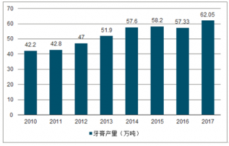 2010-2017年中國(guó)牙膏行業(yè)產(chǎn)量情況