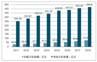2018年我國(guó)沙發(fā)行業(yè)市場(chǎng)規(guī)模約545.74億元,同比2017年的522.24億元增長(zhǎng)了4.5%,其中,功能沙發(fā)銷(xiāo)售規(guī)模約75.94億元,占比13.92%,傳統(tǒng)沙發(fā)市場(chǎng)規(guī)模469.8億元。