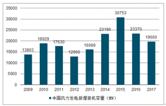 2009-2017年中國風力發(fā)電新增裝機容量統(tǒng)計
