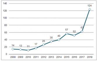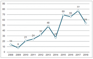 2008-2018年中國全電動注塑機相關專利申請數量