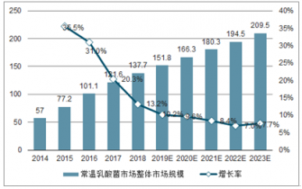 常溫乳酸菌飲品市場的增長快于整體乳酸菌飲品市場的增長速度;2014年,中國大陸的常溫乳酸菌飲品市場僅為57.0億,至2018年達到137.7億,復合增長率為24.7%。預計至2023 年,常溫乳酸菌飲品市場有望繼續(xù)增加到209.5億。