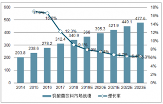 近年來,我國乳酸菌飲品市場保持了較為快速的發(fā)展,2014-2018年,乳酸菌飲品保持了13.7%的平均復合增長率,至2018年市場規(guī)模約為340.9億。未來乳酸菌飲品市場將保持持續(xù)穩(wěn)定的發(fā)展,預計2023年有望達到477.6億的規(guī)模。