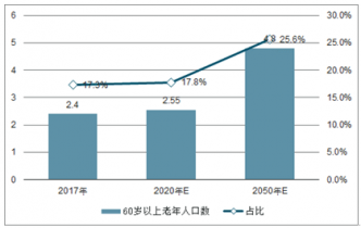 2017-2050年中國60歲以上老年人口規(guī)模及占比預(yù)測