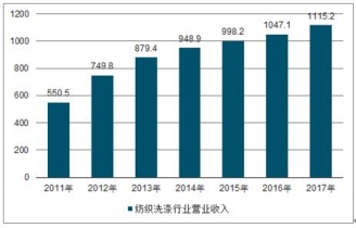 全國紡織洗滌行業(yè)營業(yè)收入從2011年的550.5億元,上升至2017年的1115.2億元,同比增長6.50%,復合增速達12.49%。