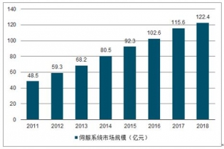 由于伺服電機系統在精度、矩頻、過載等性能上的優勢,比步進電機系統具有更廣的應用范圍,在數控機床,工業機器人等行業的推動下我國伺服系統的規模不斷增長,2011 年伺服系統市場規模48.5億元,到2019年我國伺服系統市場規模增長至122.4億元。