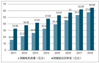 隨著產銷量的擴大,伺服電機的市場規模也不斷增長,同時由于其精度要求越來越高,制造的技術壁壘顯著提升,同時伺服驅動系統及其他方面的技術不斷成熟,向小微型發展,生產成本也顯著降低,因此伺服電機在整個伺服系統的中的占比不斷提升。安川、松下、三菱、臺達、西門子為伺服電機市場主要提供商;松下、安川、三菱、西門子、臺達為伺服驅動器市場主要提供商。2019年我國伺服電機的市場規模約為57.82億元。近幾年我國伺服電機市場規模走勢如下圖所示: