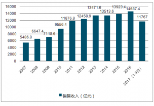 2007-2017年中國造紙行業(yè)銷售收入變化趨勢(shì)圖(億元)