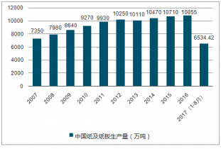 2007-2017年中國紙及紙板生產(chǎn)量變化趨勢(shì)圖(萬噸)