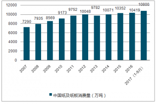 2007-2017年中國紙及紙板消費(fèi)量變化趨勢(shì)圖(萬噸)