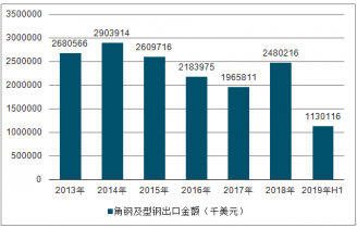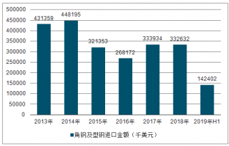 2013-2019H1中國角鋼及型鋼進口金額趨勢圖
