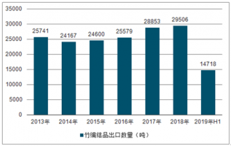 2013-2019H1中國竹編結(jié)品出口數(shù)量及出口金額統(tǒng)計(jì)表