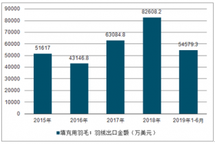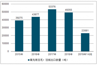 2019年1-6月中國填充用羽毛;羽絨出口數量為23061噸,同比下降9.2%;2019年1-6月中國填充用羽毛;羽絨出口金額為54579.3萬美元,同比增長17.9%。