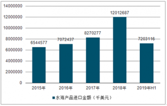 2015-2019H1中國水海產品進口金額趨勢圖