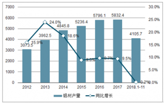 鋁是世界上產(chǎn)量和用量僅次于鋼鐵的有色金屬,產(chǎn)品性能上具有耐候性、耐沖擊、耐溶劑性、高溫滅菌性等優(yōu)良特性,可廣泛應(yīng)用于建筑裝飾、食品包裝容器、家用電器、交通運(yùn)輸、航天航空、電子通訊各個行業(yè),是發(fā)展國民經(jīng)濟(jì)與提高人民物質(zhì)文化生活的重要基礎(chǔ)材料。近幾年,隨著我國汽車、航空、建筑等行業(yè)的飛快發(fā)展,對于鋁材的需求也持續(xù)加大。從我國的鋁材產(chǎn)量來看,2012-2017年我國鋁材產(chǎn)量呈現(xiàn)逐年增長態(tài)勢,但是增長速度逐漸放緩,截止2019年11月底,我國鋁材產(chǎn)量為4105.7萬噸,同比增長0.2%。