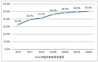 2016-2022我國(guó)功能護(hù)膚電商滲透率預(yù)測(cè)