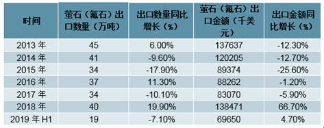 2013-2019H1中國螢石(氟石)出口數(shù)量及出口金額統(tǒng)計表