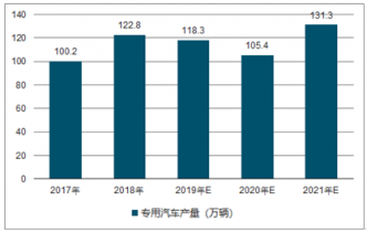 2014年,中國(guó)專用汽車產(chǎn)量為112.8萬(wàn)輛,2015年產(chǎn)量為96.8萬(wàn)輛,2016年1-6月,專用汽車市場(chǎng)回暖,產(chǎn)量同比增長(zhǎng)13.6%。預(yù)計(jì)2017年中國(guó)專用汽車產(chǎn)量將達(dá)到100.2萬(wàn)輛,未來(lái)五年(2017-2021)年均復(fù)合增長(zhǎng)率約為6.99%,2021年中國(guó)專用汽車產(chǎn)量將達(dá)到131.3萬(wàn)輛。
