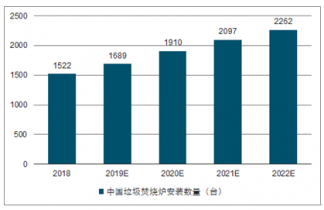 2019年中國垃圾焚燒爐安裝數(shù)量達(dá)到1,522臺,未來五年(2018-2022)年均復(fù)合增長率約為10.41%,2022年垃圾焚燒爐安裝數(shù)量將達(dá)到2,262臺。