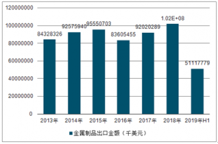 2013-2019H1中國金屬制品出口數(shù)量及出口金額統(tǒng)計(jì)表