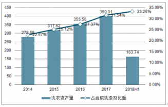 2014-2019年我國洗衣液產(chǎn)量及及占合成洗滌劑比重