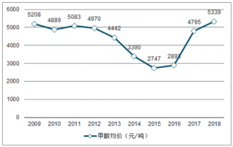 2009年到2019年國(guó)內(nèi)甲酸均價(jià)呈現(xiàn)V字走勢(shì),其中2015年達(dá)到谷底2747元/噸。