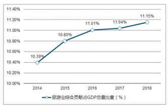 2017年全國旅游業對GDP的綜合貢獻為9.13萬億元,占GDP總量的11.04%。旅游直接就業2825萬人,旅游直接和間接就業7990萬人,占全國就業總人口的10.28%。旅游業占GDP比重自2014年起一直保持著上升的趨勢,比重從2014年的10.39%上升至2017年的11.04%。2019年旅游收入比重將繼續上漲,為11.15%。