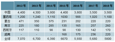 2012-2019年全球螢石產(chǎn)量分國(guó)家統(tǒng)計(jì)表(單位:千噸)