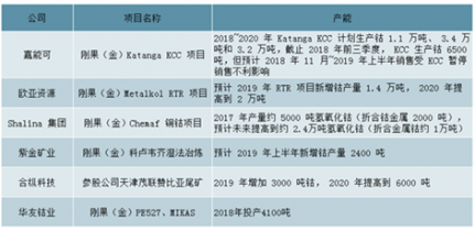 新項目投產,2019 年鈷供給壓力顯著增加。由于此前鈷價格低迷,加之新能源汽車鈷使用使用較少,鈷產能增長較為緩慢,使得 2016 年末到 2017 年鈷供給處于偏緊態勢, 2017 年新增供給主要包括金川、 Somika、萬寶礦業、 Chemaf 等。2018 年開始全球鈷龍頭企業供給陸續釋放,其中嘉能可增長顯著,根據公司規劃旗下 Katanga 的KCC 項目 2018 年、 2019 年產量達到 1.1 萬噸和 3.4 萬噸,盡管 2018 年 11 月 KCC 鈷產品因發現發射性元素,停止出口和銷售,預計將對嘉能可 2018 年四季度和 2019 年前兩個季度銷售造成影響,嘉能可產銷存在低于公司預計可能,但公司鈷供給增加趨勢并沒有變化;另外龍頭企業歐亞資源隨著 RTR 一期、二期項目投產,預計該項目 2019 年、 2020 年產量分別達到 1.4 萬噸和 2 萬噸。中國企業方面,由于部分企業在剛果(金)收購鈷原材料,實際上可視為規范化“手抓礦”供給,對增量影響可能較小。從礦源頭看中國企業鈷礦供給主要有紫金礦業 2019 年新增 2400 噸、合縱科技 2019 年新增鈷供給 3000 噸,預計 2020 年提高到 6000 噸;華友鈷業 PE527 和 Mikas 合計約4100 噸鈷產能已于 2018 年投產,預計 2019 年產能將得到較好發揮。