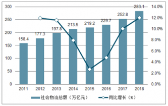 2011-2018年中國社會物流總額及增速情況