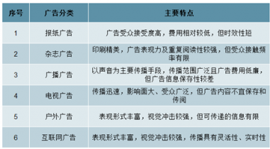 根據(jù)《中華人民共和國廣告法》,廣告指商品經營者或者服務提供者通過一定媒介和形式直接或者間接地介紹自己所推銷的商品或者服務的活動。根據(jù)廣告發(fā)布所依托的媒體形式,廣告可以分為報紙廣告、雜志廣告、廣播廣告、電視廣告、戶外廣告和互聯(lián)網(wǎng)廣告等,其主要特點如下所示: