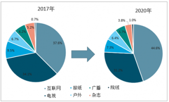 2017年及2020年(預測),全球廣告市場中不同媒體所占據(jù)的廣告花費支出比例情況