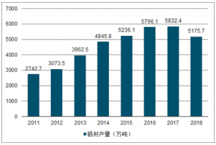 2011-2019年我國(guó)鋁材產(chǎn)量(萬(wàn)噸)
