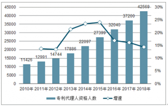 2010年,我國(guó)專利代理人為11426人,此后平均以18%左右的速度增長(zhǎng)。截止2019年12月,我國(guó)專利代理資格人數(shù)為42569人,同比上年增長(zhǎng)14.43%。
