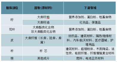 工業大麻的下游領域已經拓展至紡織、醫療、食品、化妝品、建材等十多個領域。從大麻籽中提取的大麻籽油可以用作化妝品和保健品,花葉中的化合物可以用作醫療用途,皮中的大麻纖維可以用作紡織品和新材料領域,桿芯可以用作建筑材料,根可以用于燃料和電池正負極材料。
