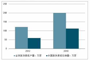 2012 -2018年全球裝飾原紙產(chǎn)量及中國裝飾原紙總銷量情況