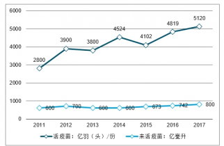 2017年活疫苗生產(chǎn)能力約5120億羽(頭)份,滅活疫苗生產(chǎn)能力約800億毫升。