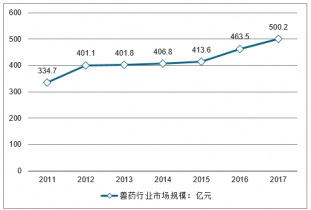 2011年我國獸藥市場規(guī)模約334.7億元,到2017年我國獸藥市場規(guī)模達(dá)到了500多億元,年復(fù)合增長率6.93%。