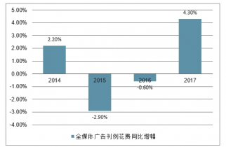 全媒體廣告刊例花費迎來復蘇。2017 年全年全媒體廣告刊例花費同比增長 4.3%,在連續(xù)兩年下跌后有所反彈,國內廣告市場整體趨勢向好。