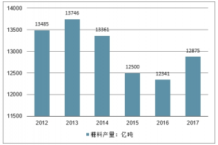 2013-2016年中國糖料產(chǎn)量逐年下降,2016年糖料產(chǎn)量1.23億噸;2017年,中國糖料產(chǎn)量1.28億噸。