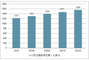 2019年中國(guó)公民出境旅游花費(fèi)將達(dá)到1223億美元,未來(lái)五年(2018-2022)年均復(fù)合增長(zhǎng)率約為6.27%,2022年中國(guó)公民出境旅游花費(fèi)將達(dá)到1560億美元。