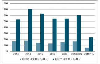 2019年我國(guó)鋼材出口金額606.01億美元,同比增長(zhǎng)11.2%;2019年1-5月我國(guó)累計(jì)出口金額234.24億美元,同比減少4.6%。