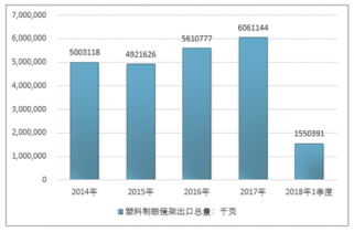 2016年我國塑料制眼鏡架出口總量5610777千克 ,2017年出口總量6061144千克 ;2018年1季度出口總量1550391千克 。