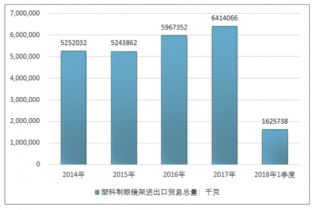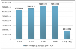 2016年我國塑料制眼鏡架進出口貿易總額728339177美元,2017年進出口貿易總額729213008美元;2018年1季度進出口貿易總額183223852美元。
